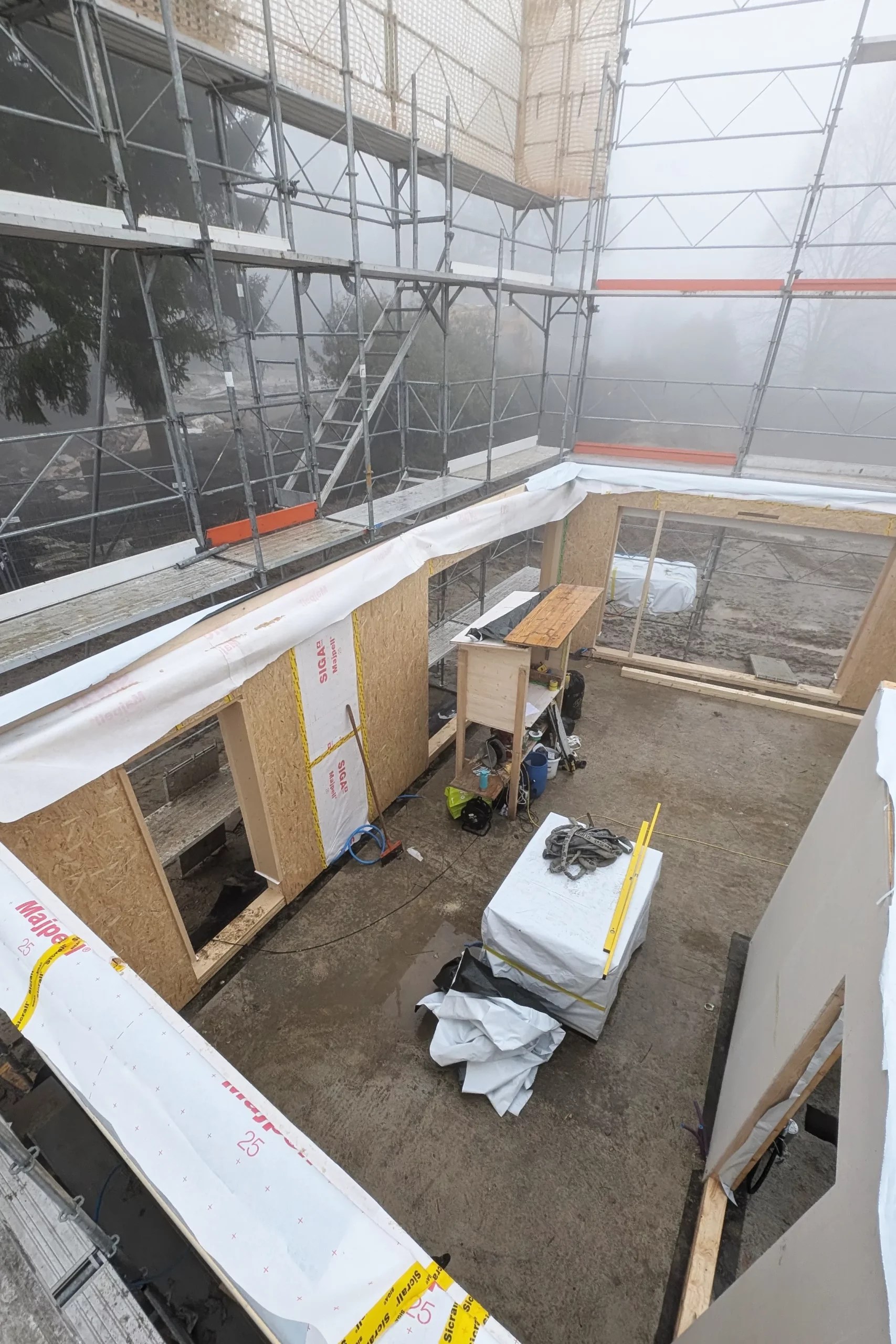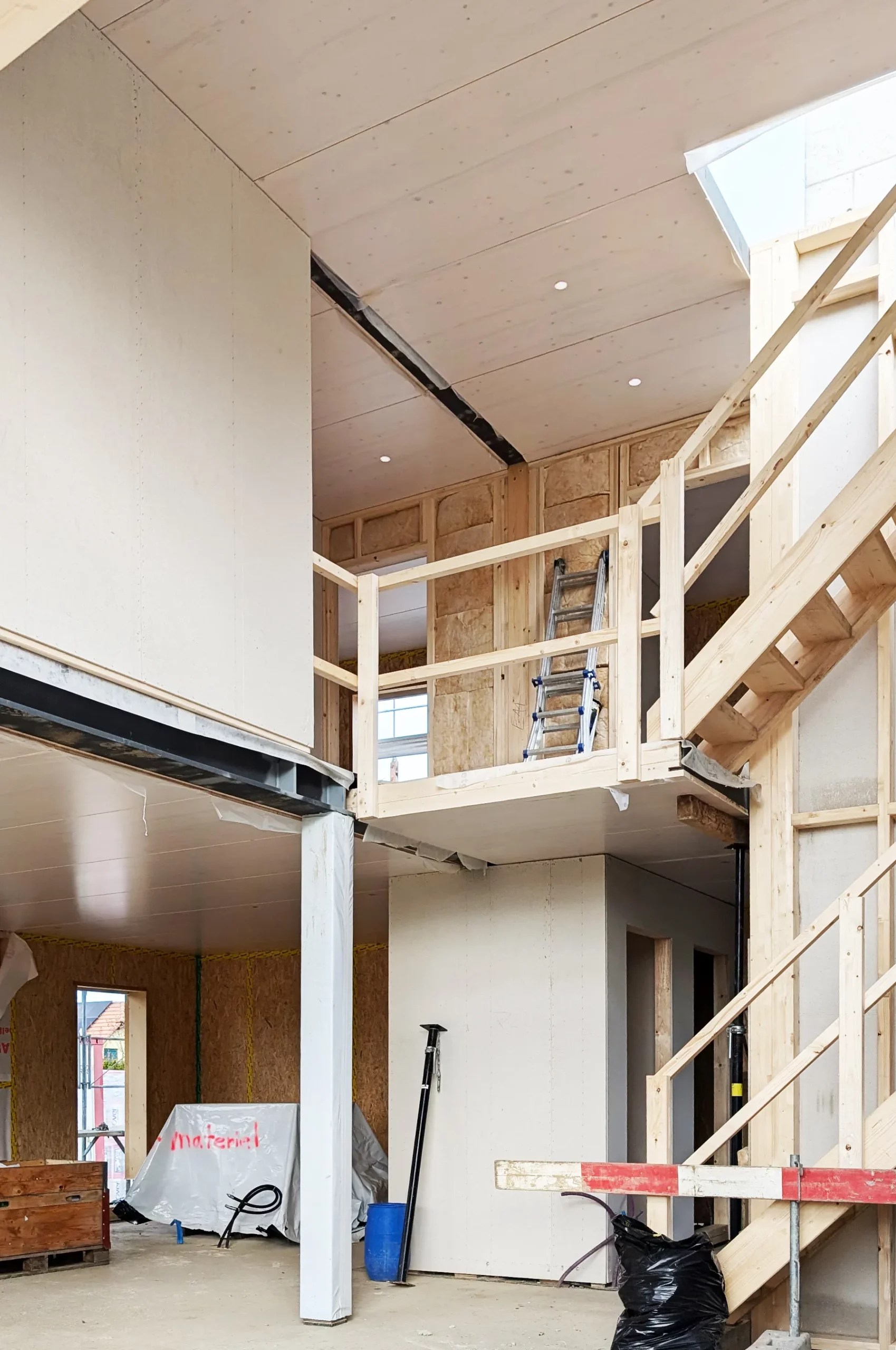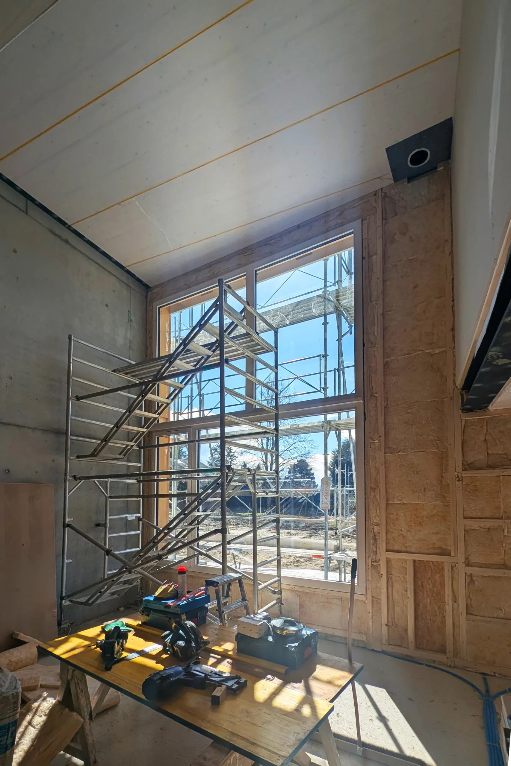 L’enveloppe est soigneusement isolée, et l’ensemble du bâtiment est équipé d’une ventilation simple flux assurant un renouvellement d’air maîtrisé. Un système domotique permet d’optimiser en temps réel la consommation des équipements techniques et des protections solaires.