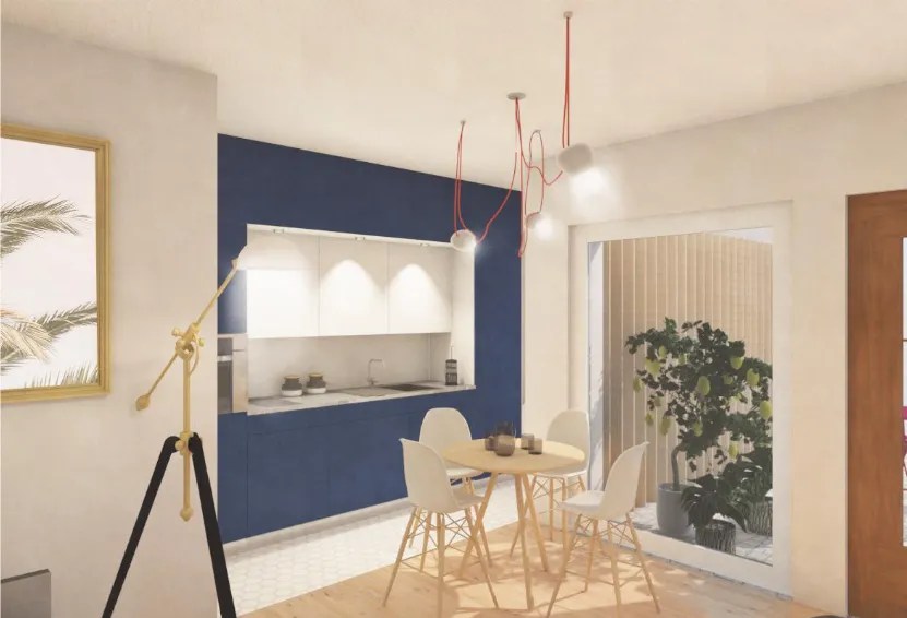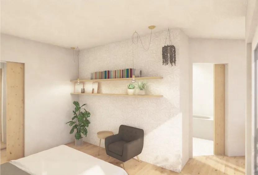 A l’emplacement de l’actuelle buanderie, du local citerne et d’une chambre, les propriétaires souhaitent étudier le potentiel de création d’un studio. L’avant-projet étudie trois possibilités d’organisation. La première variante se présente en un grand espace ouvert avec la salle d’eau à l’emplacement du wc existant. La deuxième variante déplace la salle de bains derrière la cuisine et crée deux espaces distincts ; l’espace de nuit et l’espace de jour. La dernière variante propose de placer la cuisine et l’espace de jour dans l’aile droite afin de bénéficier de la vue.