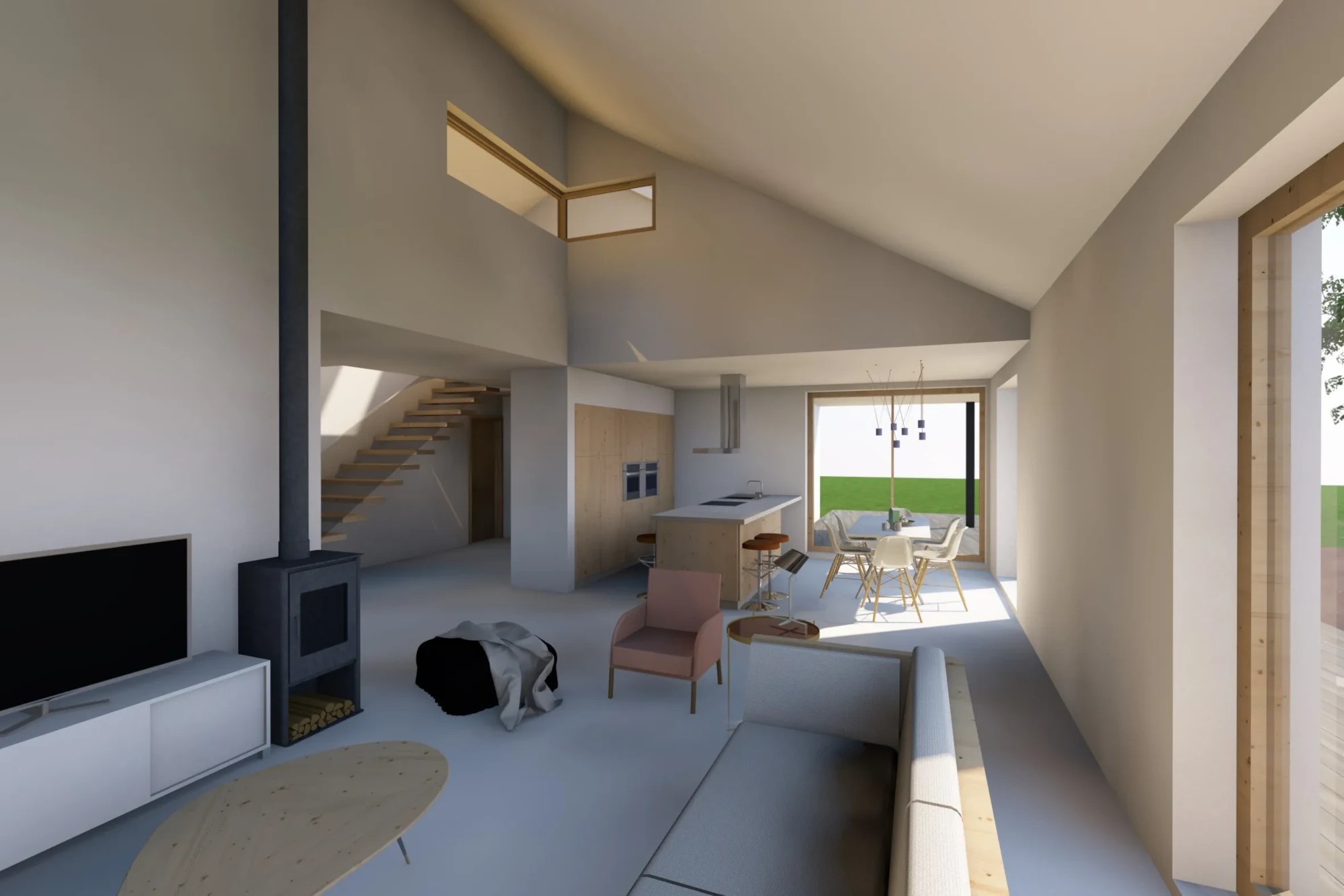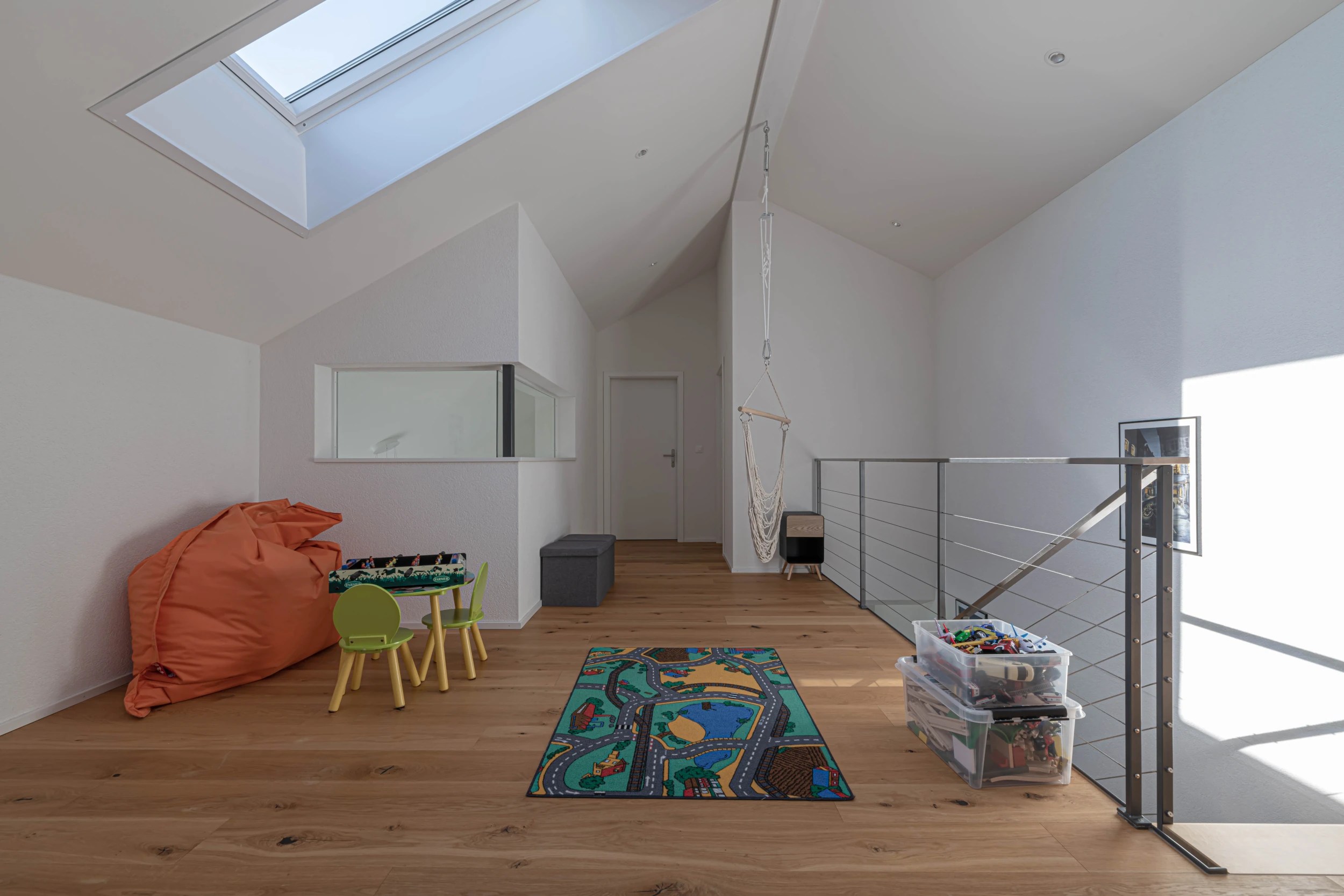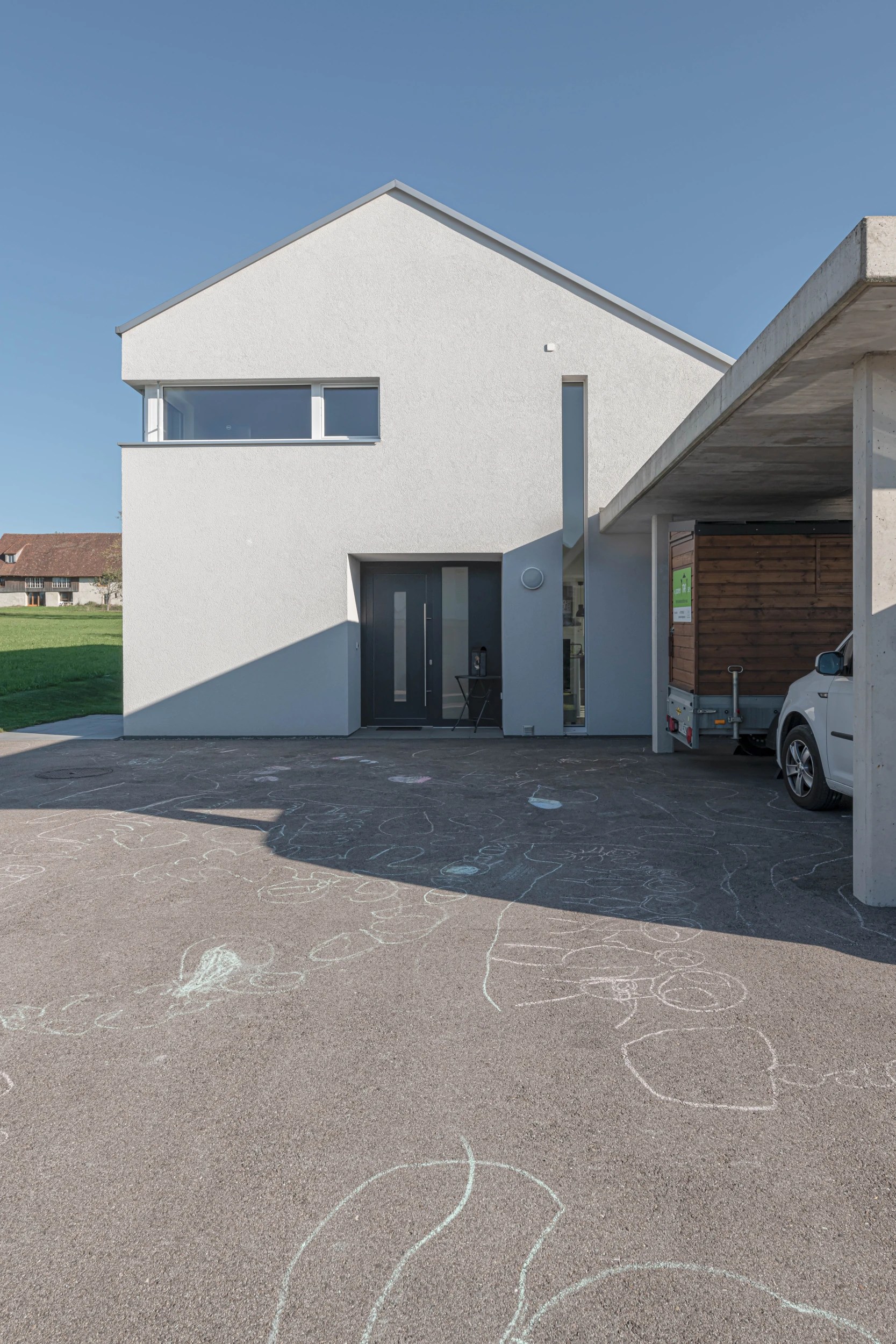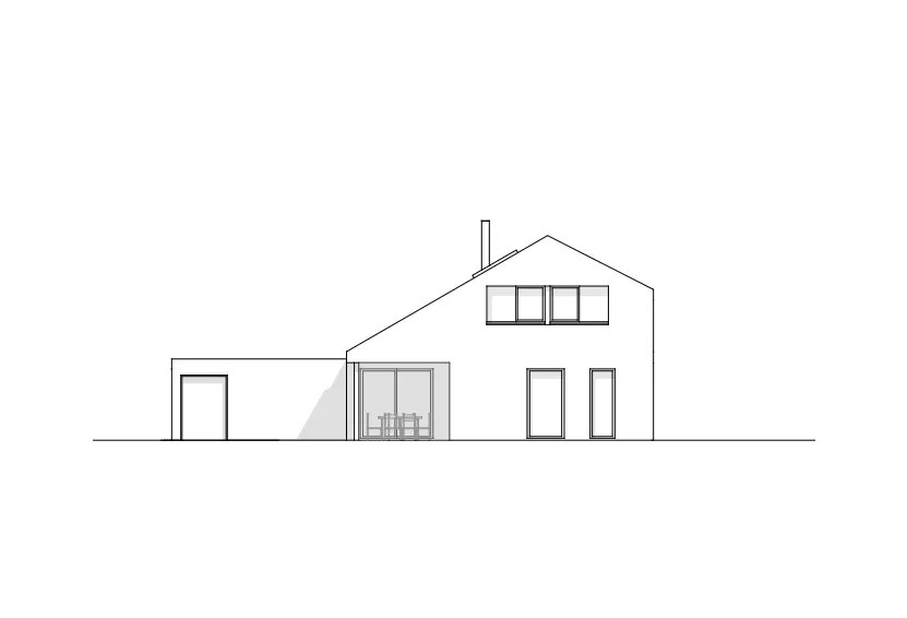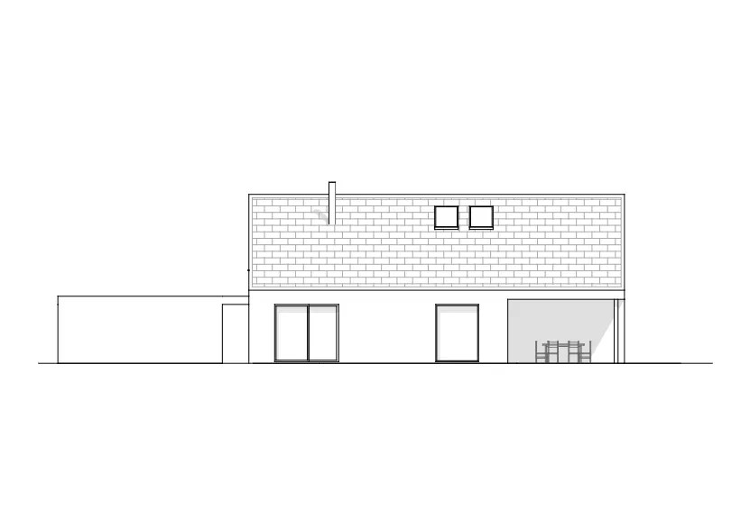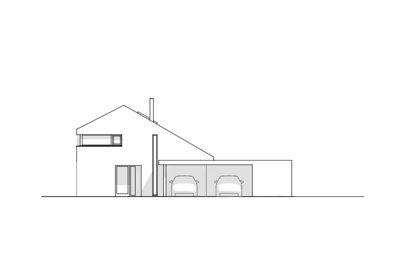 Cette villa familiale s’implante dans un quartier résidentiel. La façade sur rue de la villa est relativement fermée pour garantir la privacité. De la même manière, la dépendance extérieure et le couvert à voitures cherchent à privatiser le jardin. Au rez-de-chaussée se trouvent un wc, la suite parentale, un cellier, la cuisine, la buanderie et le séjour. Celui-ci bénéficie d’une double hauteur sous le toit à deux pans. Des percées visuelles sont cherchées à l’intérieur de l’espace grâce à une fenêtre communiquant entre l’espace jeux des enfants et cette double hauteur. A l’étage on trouve les deux chambres d’enfants, une salle de bains, un rangement ainsi qu’un bureau qui peut également servir de chambre d’ami.
