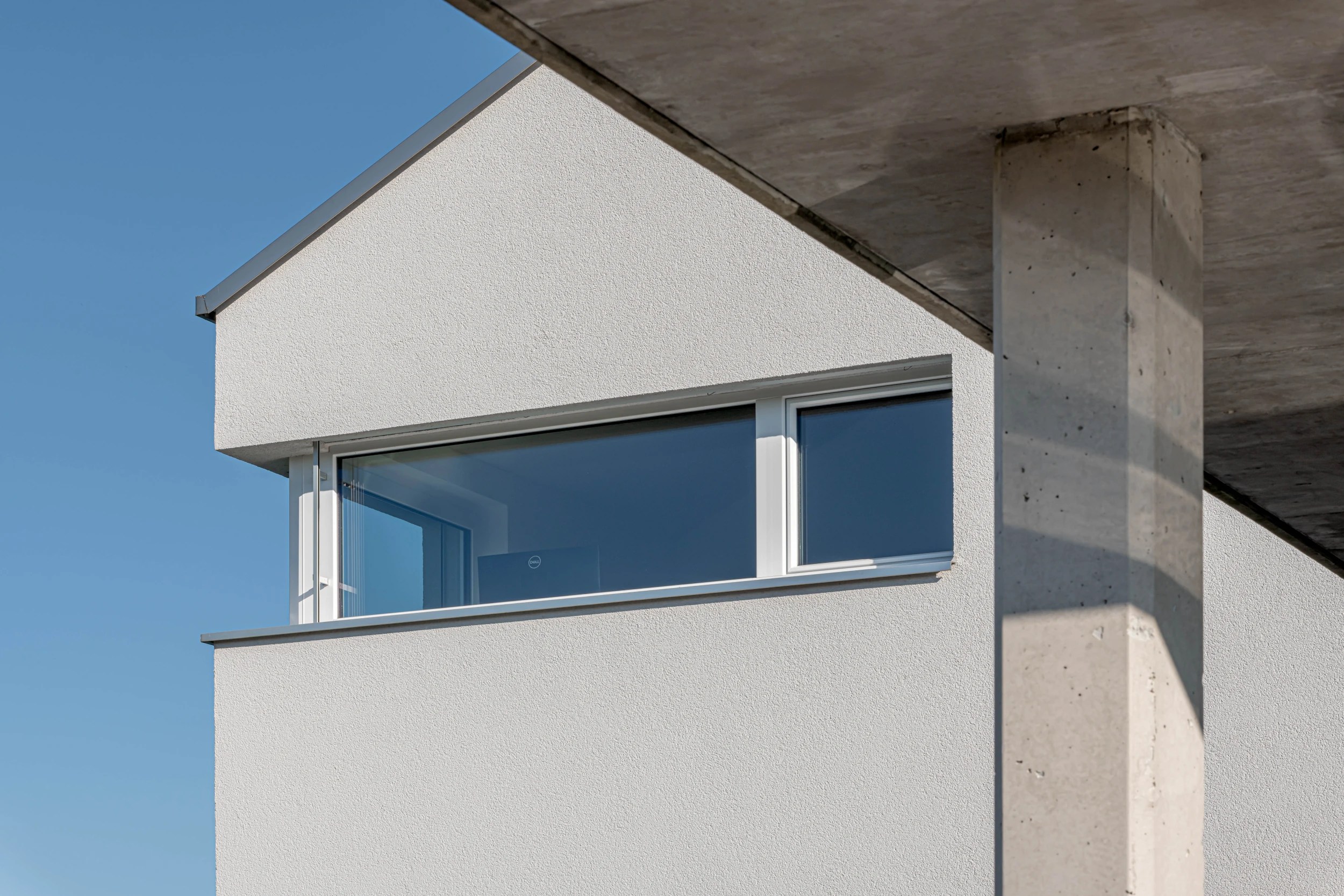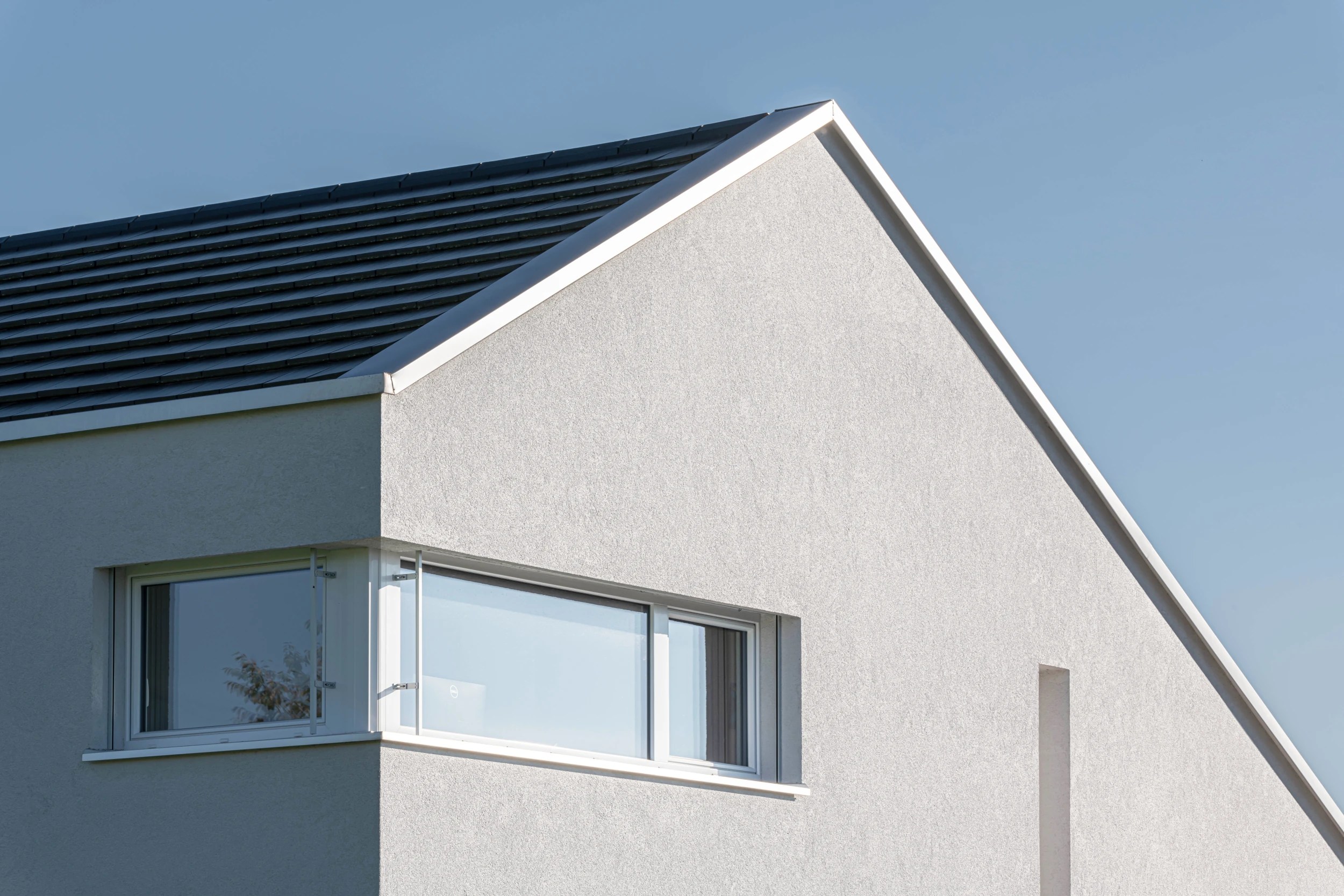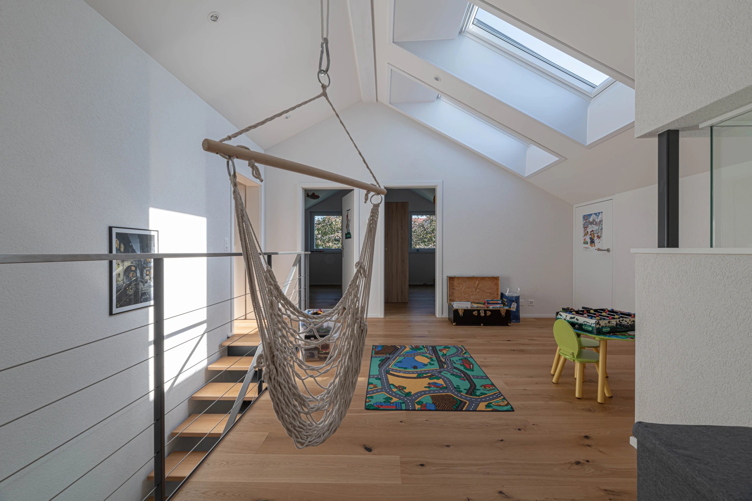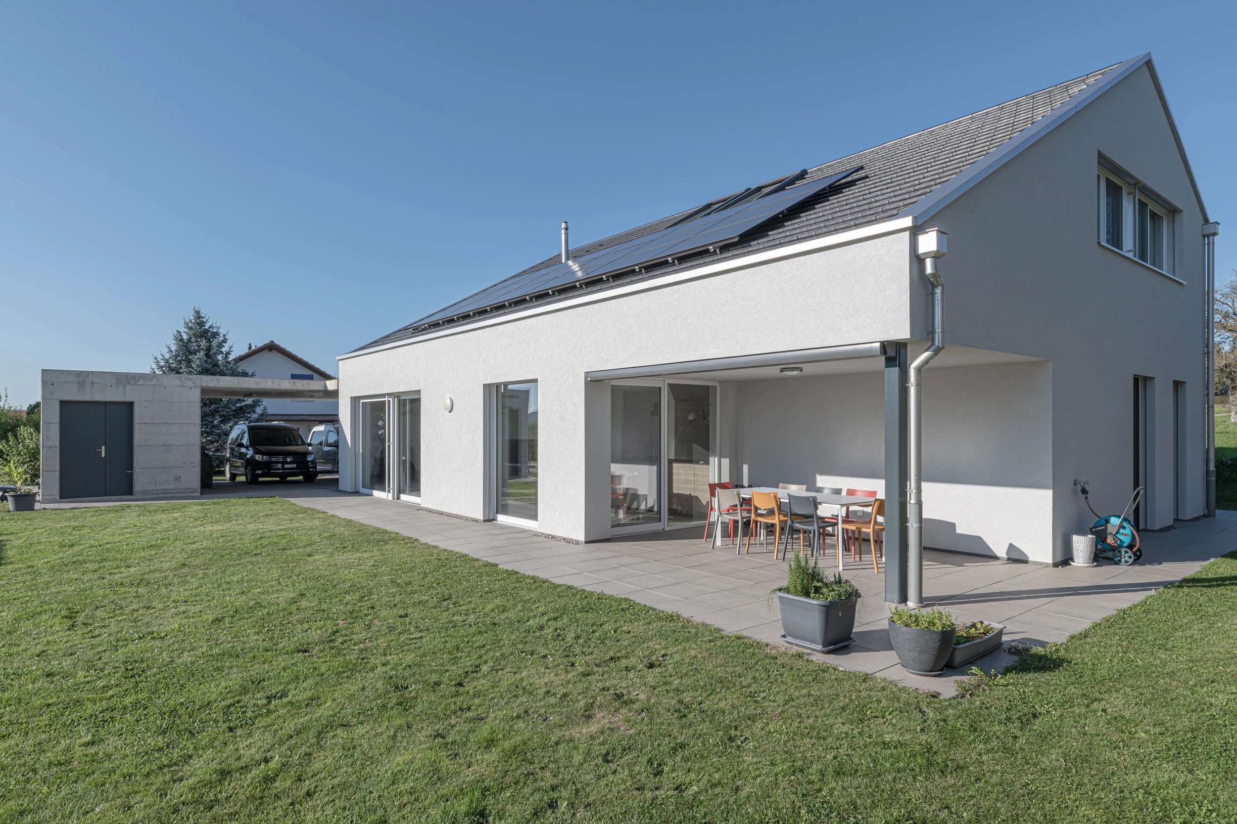 Cette villa familiale s’implante dans un quartier résidentiel. La façade sur rue de la villa est relativement fermée pour garantir la privacité. De la même manière, la dépendance extérieure et le couvert à voitures cherchent à privatiser le jardin. Au rez-de-chaussée se trouvent un wc, la suite parentale, un cellier, la cuisine, la buanderie et le séjour. Celui-ci bénéficie d’une double hauteur sous le toit à deux pans. Des percées visuelles sont cherchées à l’intérieur de l’espace grâce à une fenêtre communiquant entre l’espace jeux des enfants et cette double hauteur. A l’étage on trouve les deux chambres d’enfants, une salle de bains, un rangement ainsi qu’un bureau qui peut également servir de chambre d’ami.