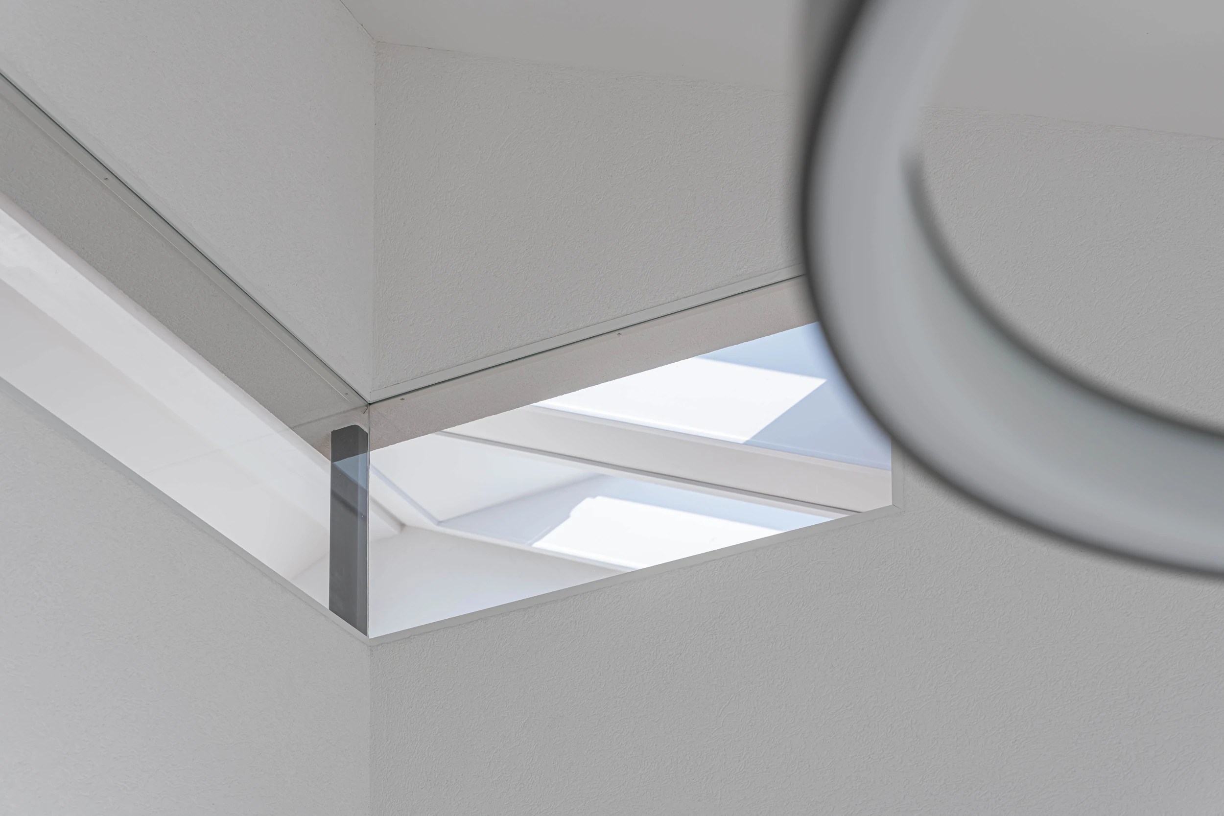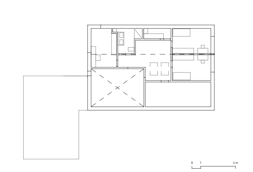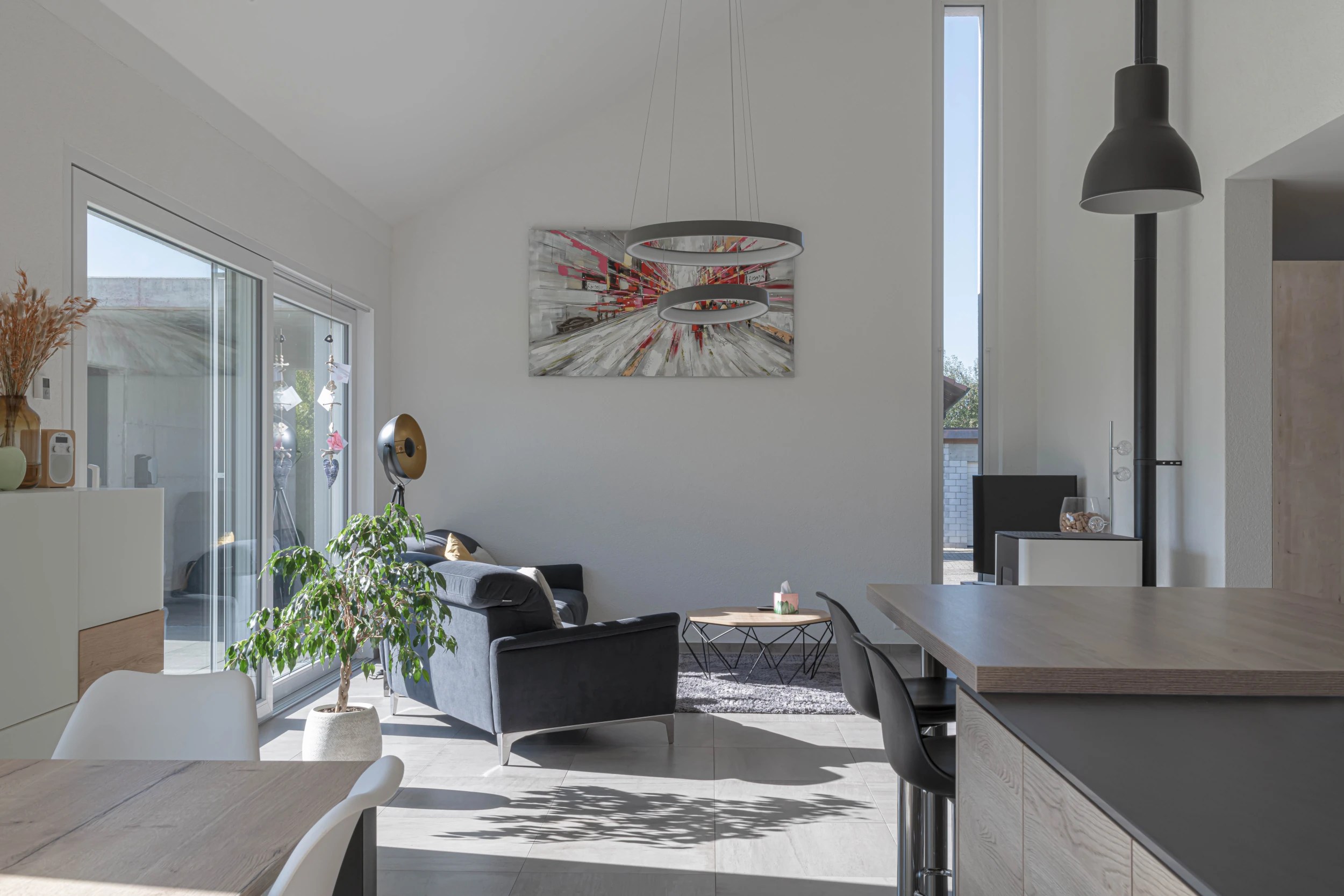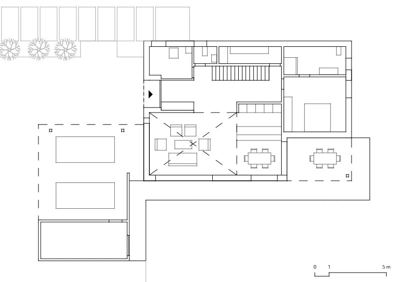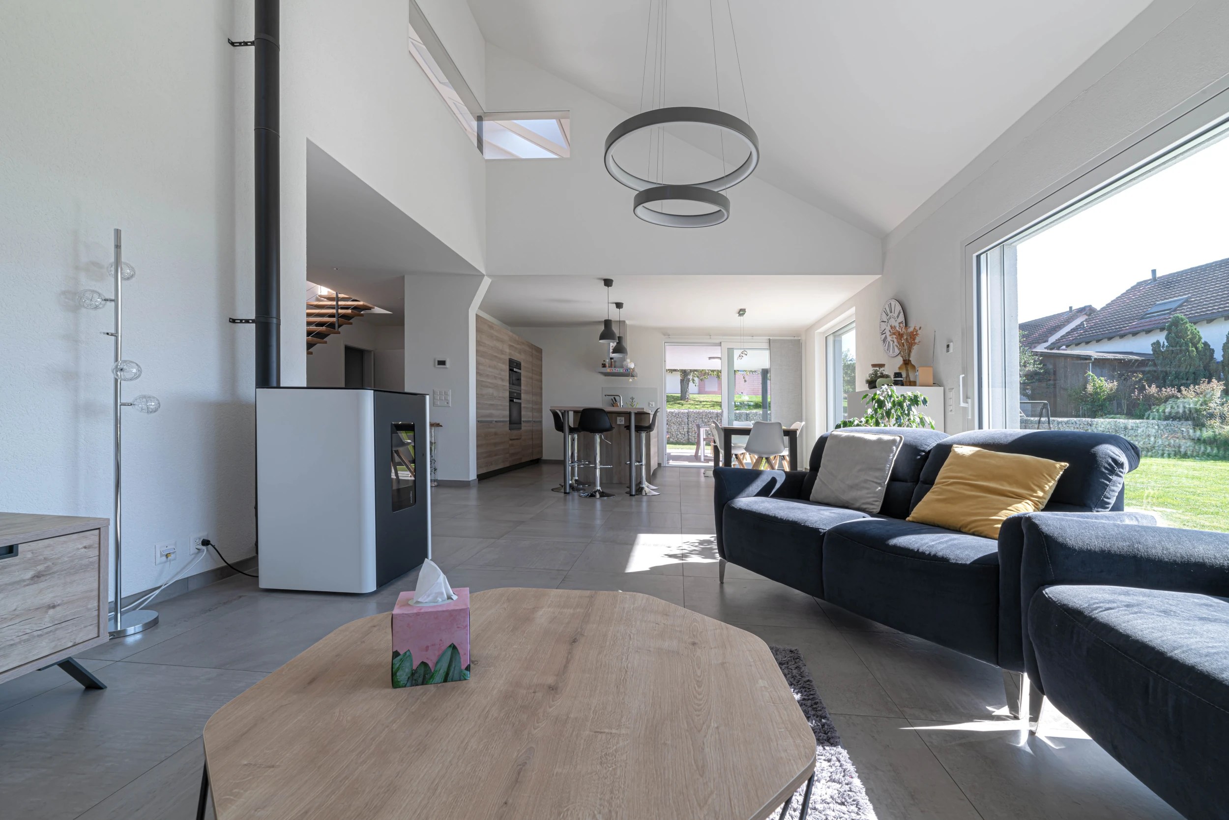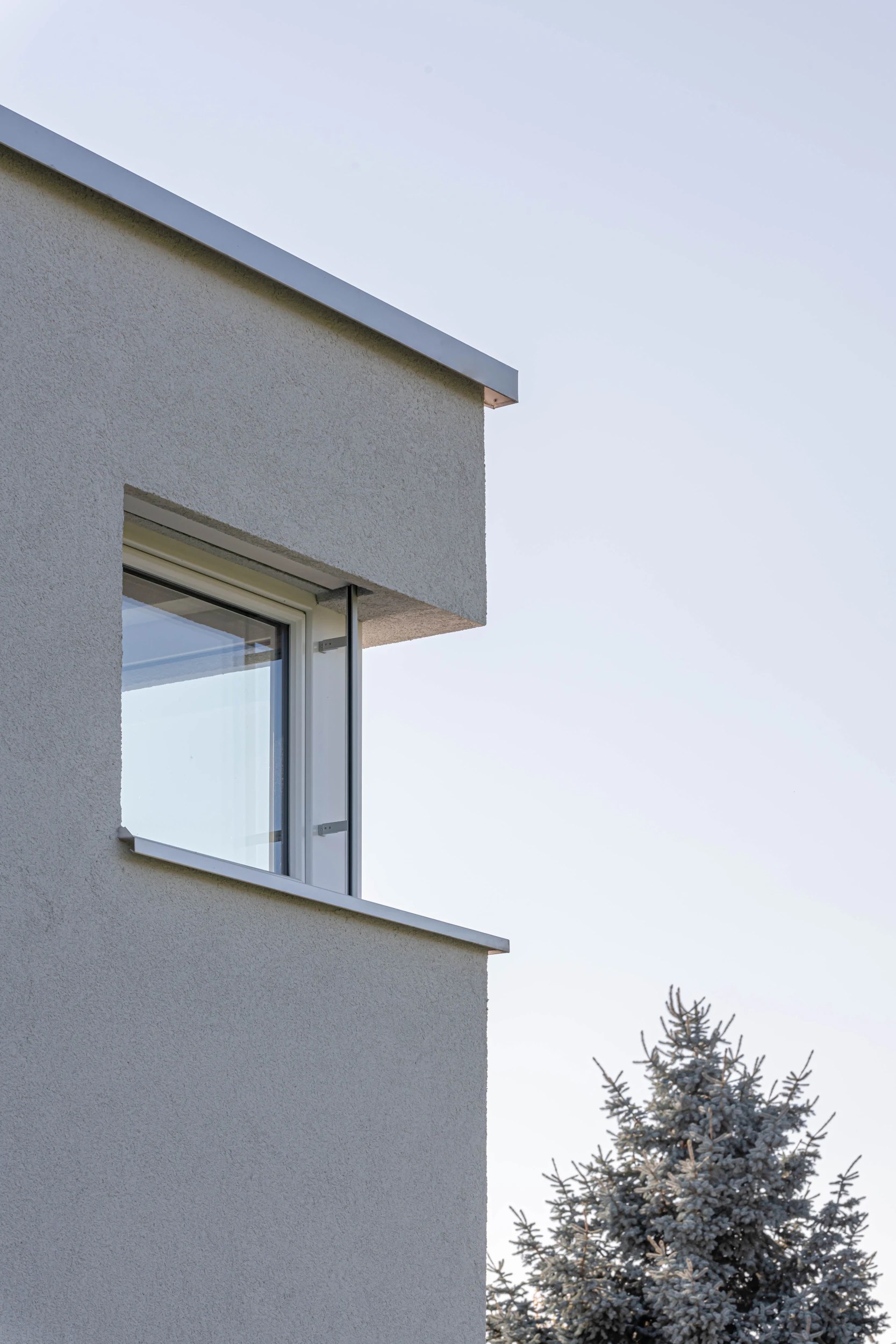 Cette villa familiale s’implante dans un quartier résidentiel. La façade sur rue de la villa est relativement fermée pour garantir la privacité. De la même manière, la dépendance extérieure et le couvert à voitures cherchent à privatiser le jardin. Au rez-de-chaussée se trouvent un wc, la suite parentale, un cellier, la cuisine, la buanderie et le séjour. Celui-ci bénéficie d’une double hauteur sous le toit à deux pans. Des percées visuelles sont cherchées à l’intérieur de l’espace grâce à une fenêtre communiquant entre l’espace jeux des enfants et cette double hauteur. A l’étage on trouve les deux chambres d’enfants, une salle de bains, un rangement ainsi qu’un bureau qui peut également servir de chambre d’ami.